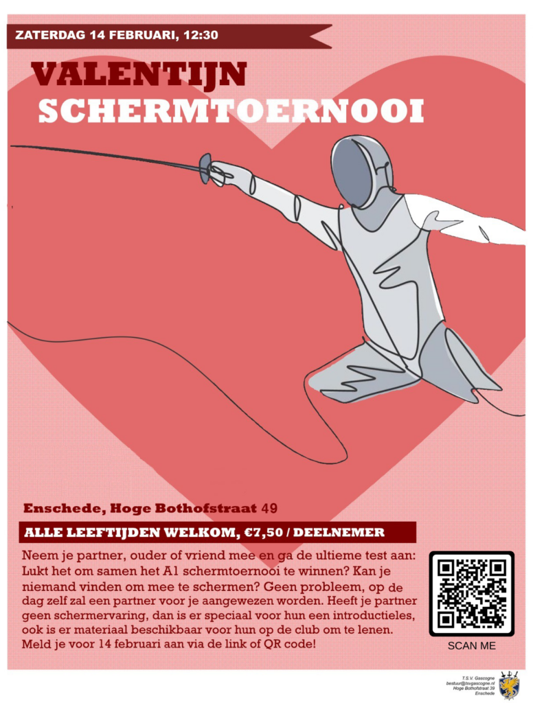 Het valentijnstoernooi is het toernooi om samen met je partner, familie of verre neef de degen te kruisen tegen andere duo’s. Niet-schermers zijn ook welkom!