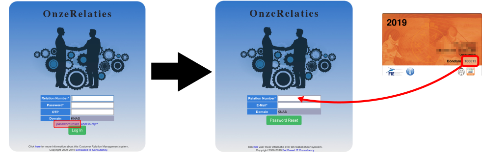 Klik op ‘password reset’ om een nieuw wachtwoord op te vragen. Het bondsnummer vind je op je KNAS pas.