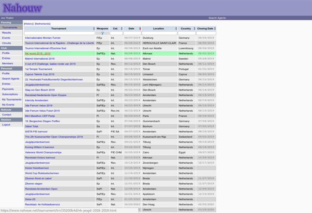 Na het inloggen zie je in de linker kolom ‘Tournaments’ (of ‘Wedstrijden’), waarmee je een overzicht van alle komende wedstrijden op kunt vragen. In deze lijst zie je trouwens ook de uiterste inschrijfdatum per toernooi, belangrijk om in de gaten te houden! Klik op het toernooi waarvoor je je aan wilt melden.
