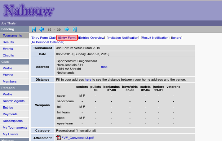 Bovenaan elke toernooipagina kun je je via ‘Inschrijfformulier’ (‘Entry form’) aanmelden.